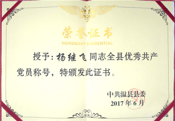 楊繼飛2017年度被評為全縣優秀共產黨員稱號